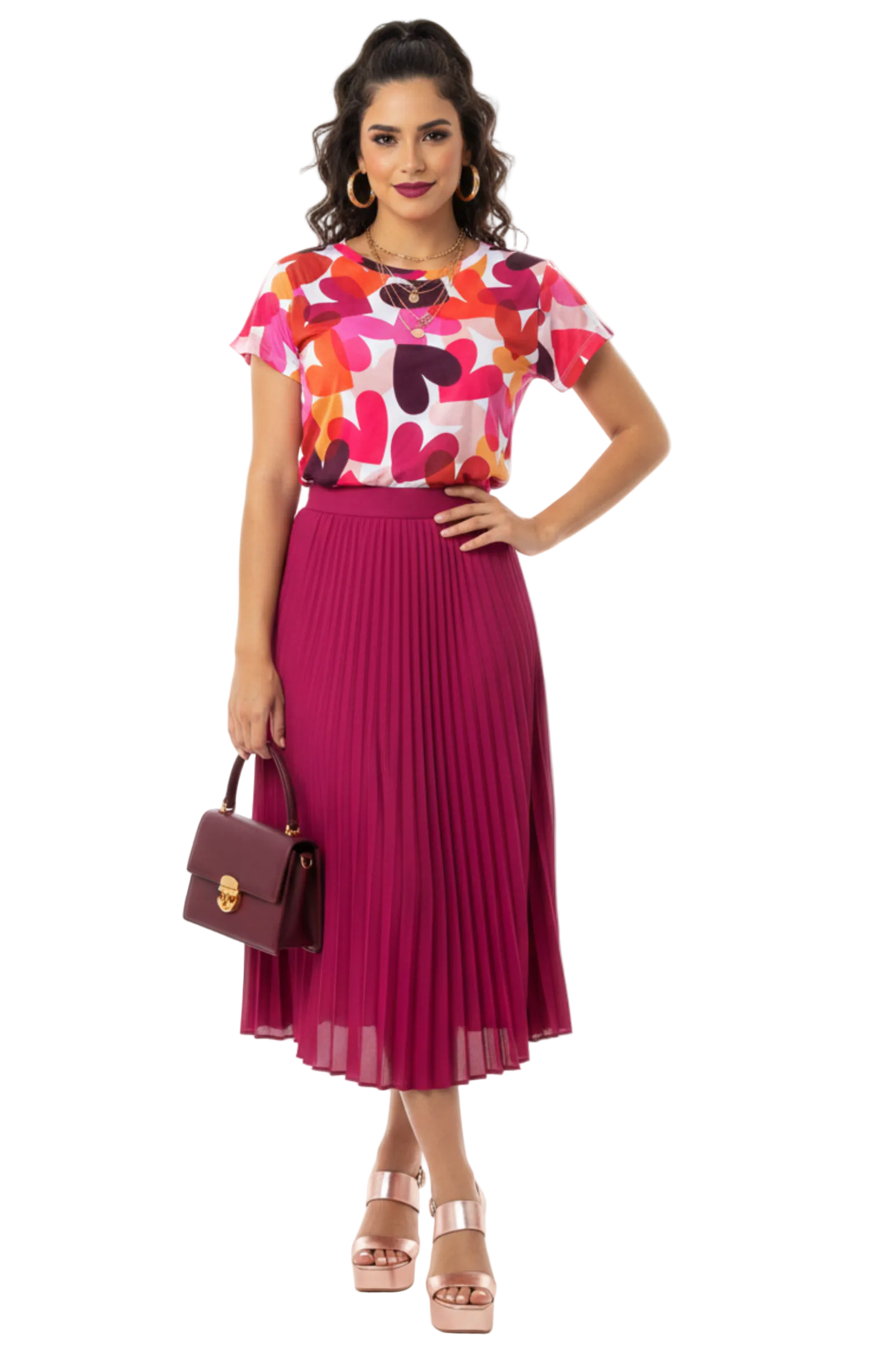 Estampado: Diseño all-over de corazones entrelazados en una paleta cálida de rojos, rosas, naranjas y púrpuras.